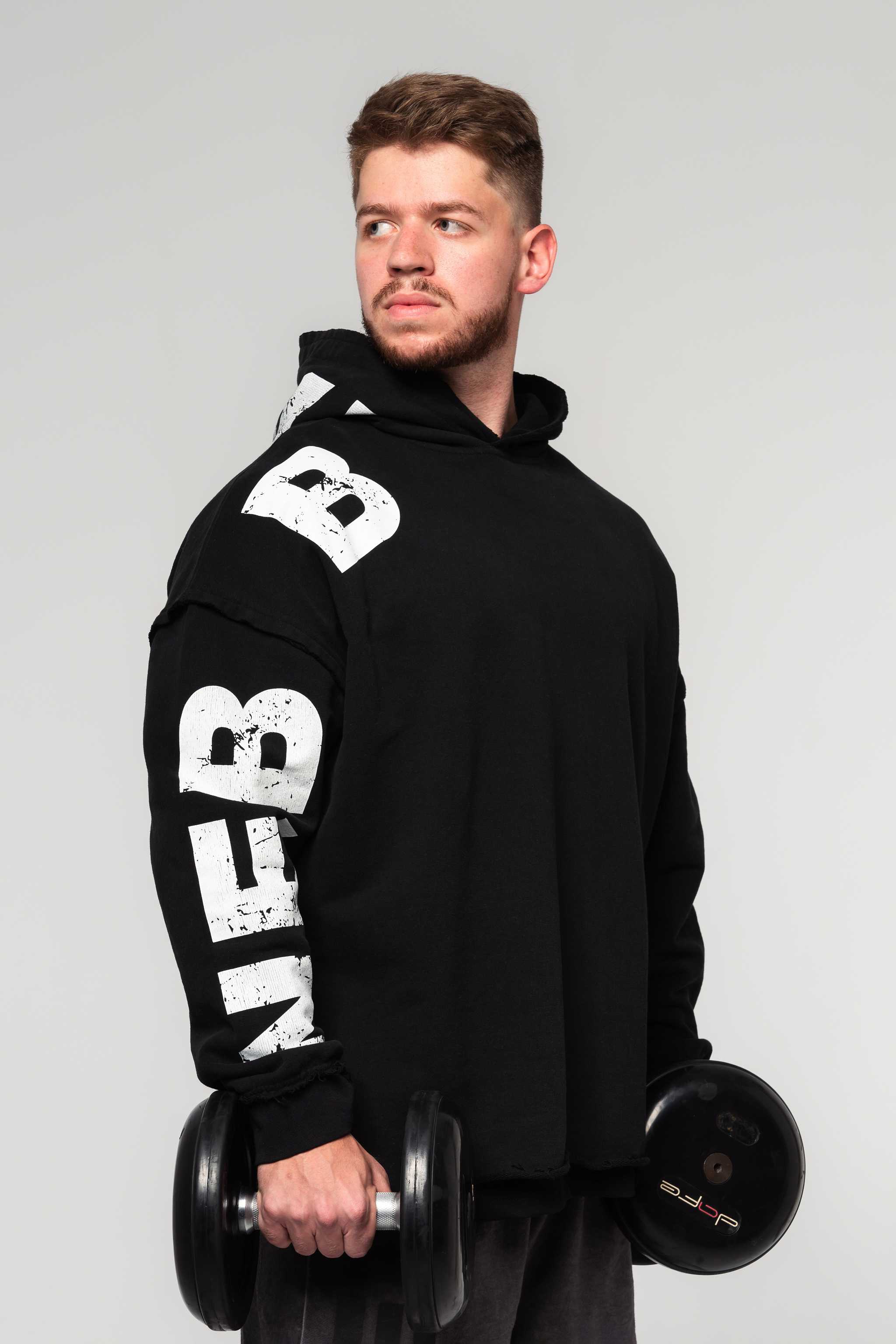 The extreme oversized fit makes you look bigger, and the unfinished 'raw' effect brings the vibe of the iconic 90s gym era. Put on the hood. Play your favorite playlist. And warm up before your workout in the NEBBIA hoodie.