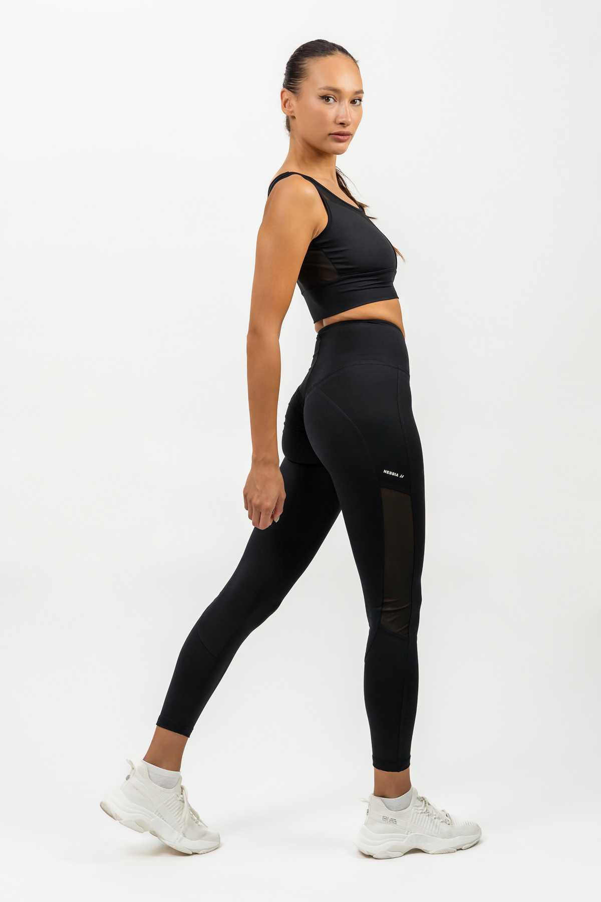 These women’s mesh leggings have a V-shaped high waist that keeps the leggings firmly in place. It also prevents it from rolling and shapes the figure beautifully. The breathable mesh on the sides not only looks stylish but is also guaranteed to boost your self-confidence. The mesh is lined on the sides so you don’t have to worry about exposing your underwear. Thanks to the technologies we used, the leggings retain their shape, colour and wick away sweat for a long time. You can fully enjoy the properties of the innovative material during functional training, yoga or cardio training.