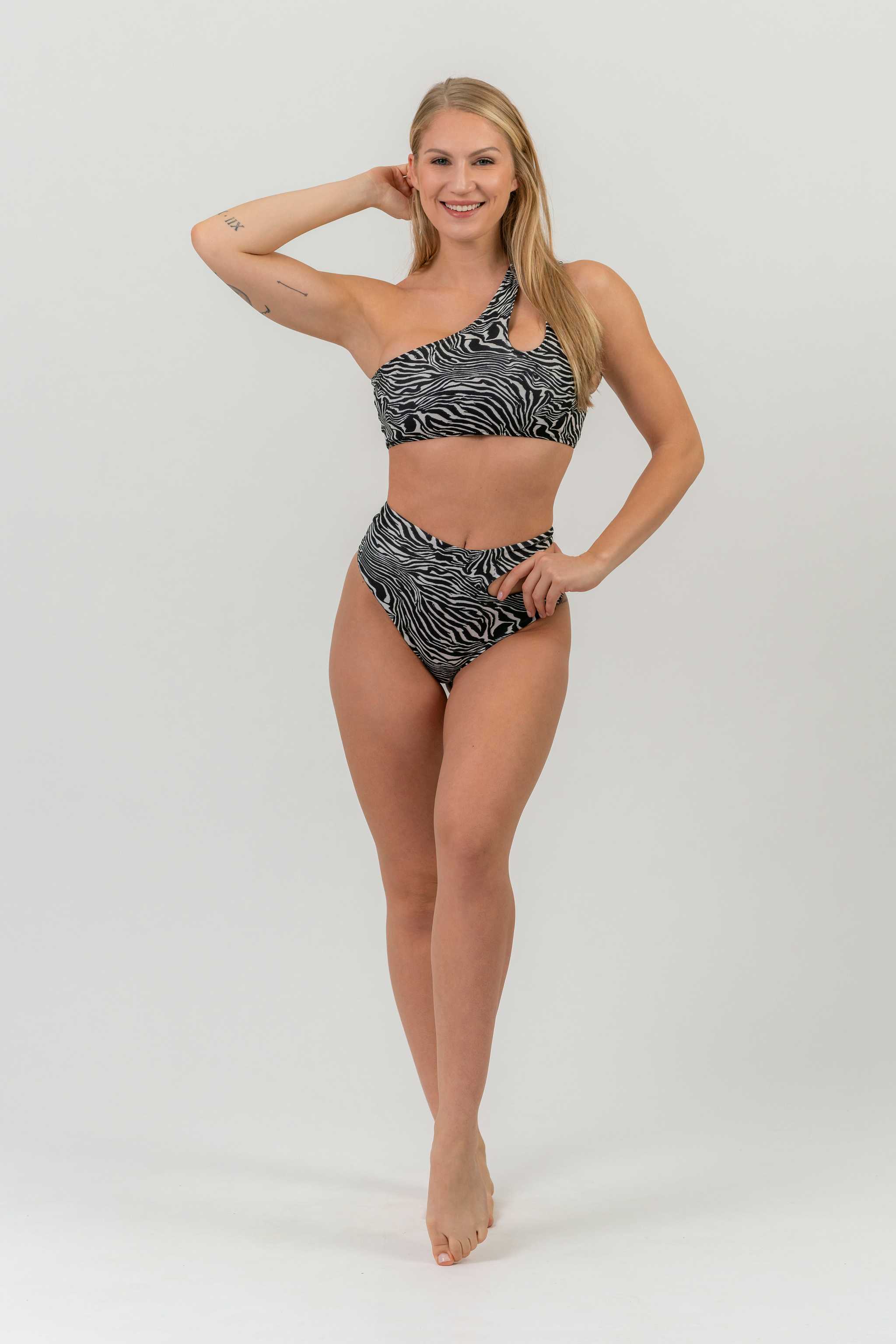 The asymmetrical side teardrop cutout is a clever detail that turns ordinary bikini panties into a unique bit. The high waist is very feminine and provides you with support in the right places. The high neckline makes you visually slimmer and lengthens your legs. It doesn’t matter if you have a wider or narrower waist, pronounced hips or boyish curves – this swimsuit is sure to fit you.